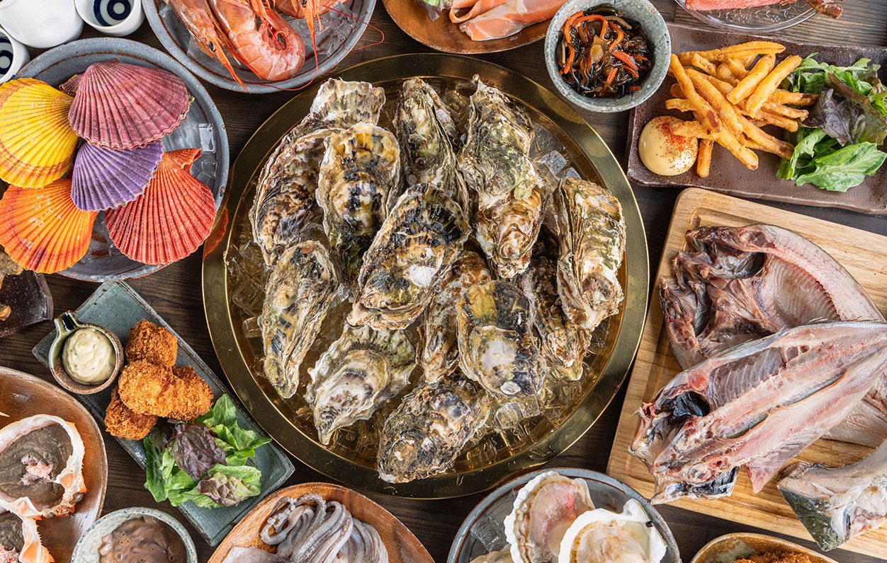 牡蠣だけではなくバラエティに富んだ海鮮や肉串を豊富に取り揃え、