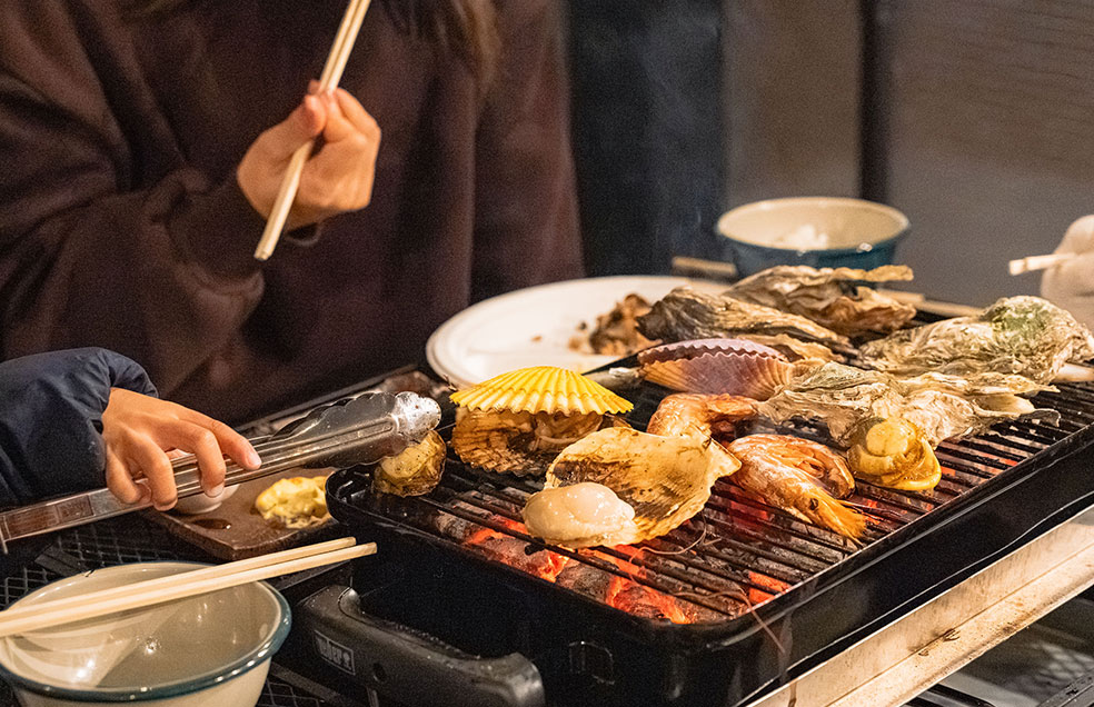 牡蠣(焼き牡蠣、蒸し牡蠣)、緋扇貝、白ハマグリ、サザエ、大アサリをはじめとした貝類の他、干物(稚内産ほっけ、沼津産金目鯛等)、豊富な肉串やソーセージ、カキフライやホタテフライ、ソフトドリンク、アルコール各種取り揃えております。